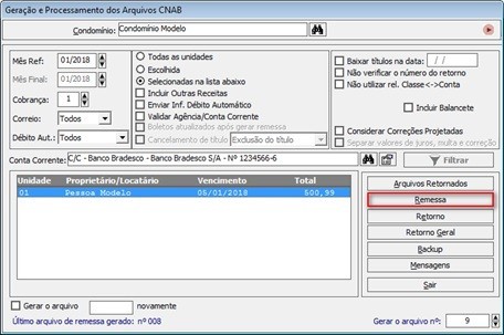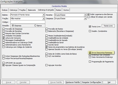 Antes de gerar o arquivo de remessa, confirme se o parâmetro Envio Descontos Remessa disponível no menu Cadastros > Condomínios > Configurações Avançadas > Cobrança Avançada está marcado, caso não esteja habilite-o para que os valores dos descontos sejam inseridos no arquivo.