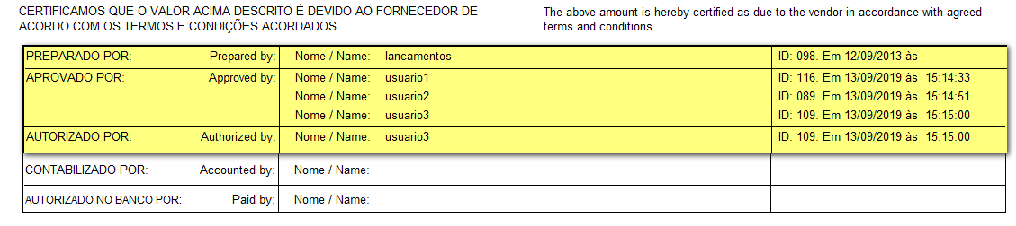 Ao visualizar o relatório Liberação de Pagamento, o campo Aprovado por, apresentará a identificação automática dos usuários aprovadores e o usuário criador do lançamento.