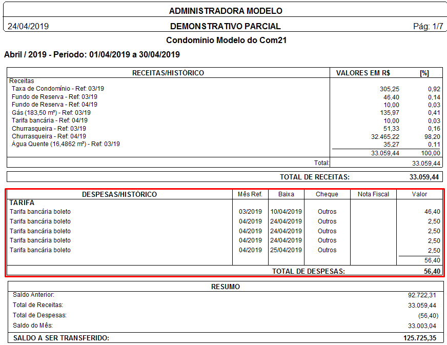 Ao visualizar ou imprimir o relatório, no bloco Despesas/Histórico as tarifas bancárias serão agrupadas por mês de referência, conforme imagem a seguir. As informações de data da baixa, número do cheque e da nota fiscal não serão exibidos quando se optar pelo agrupamento.