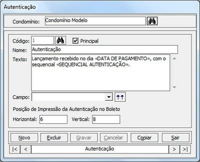 Nesse exemplo inserimos os parâmetros «DATA DE PAGAMENTO», «UNIDADE» e «SEQUENCIAL AUTENTICAÇÃO». Ao visualizar a autenticação o sistema irá substituí-los de acordo com os dados do condomínio escolhido.