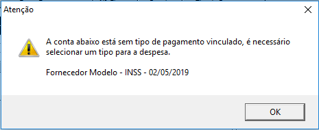 O sistema funcionará da forma padrão, exigindo que seja selecionado um tipo de pagamento para realizar a baixa. Entretanto, um alerta será exibido mostrando qual a despesa que está sem esta informação, pois assim se estiverem selecionadas mais de uma conta, ficará mais fácil identificar qual precisa ter o tipo de pagamento vinculado.