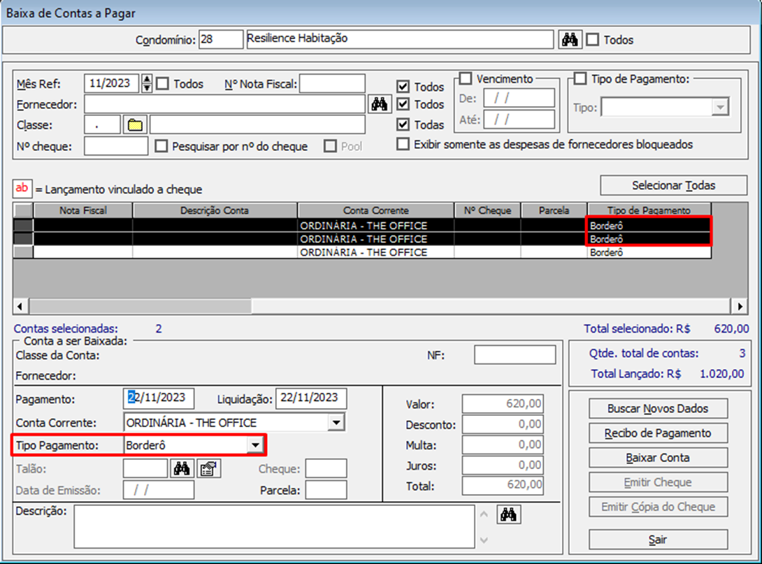 O filtro Tipo de pagamento será preenchido com o nome do tipo vinculado às despesas e a baixa acontecerá da forma padrão.