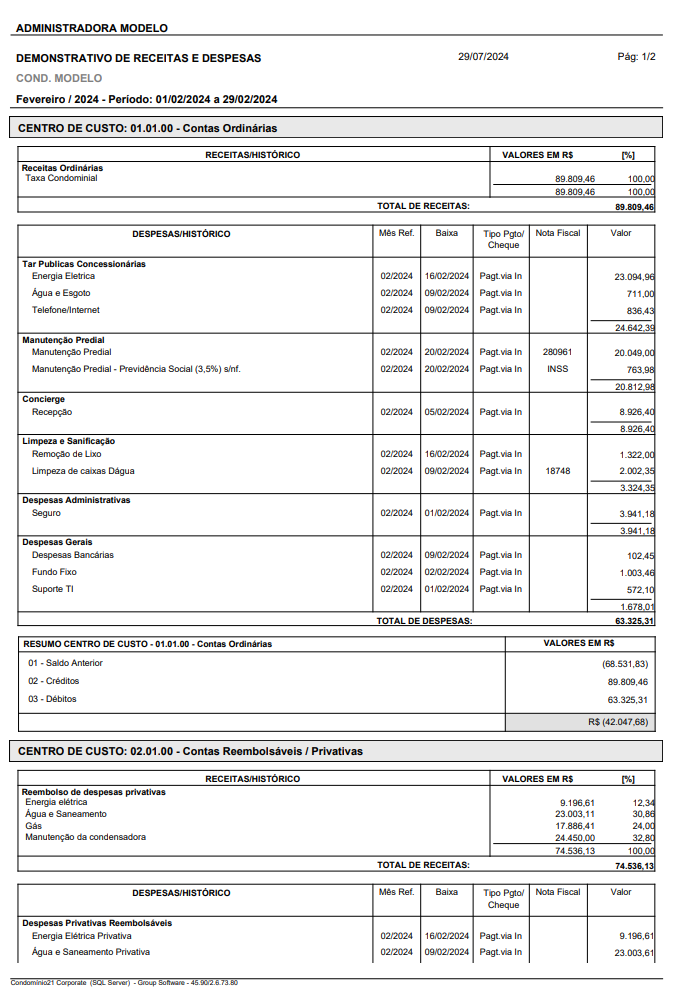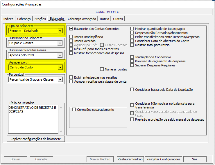 Para utilizar este modelo é necessário que a opção ‘Centro de Custo’ esteja selecionada nas configurações de balancete do condomínio. Essa opção estará disponível somente para o formato detalhado de balancete.