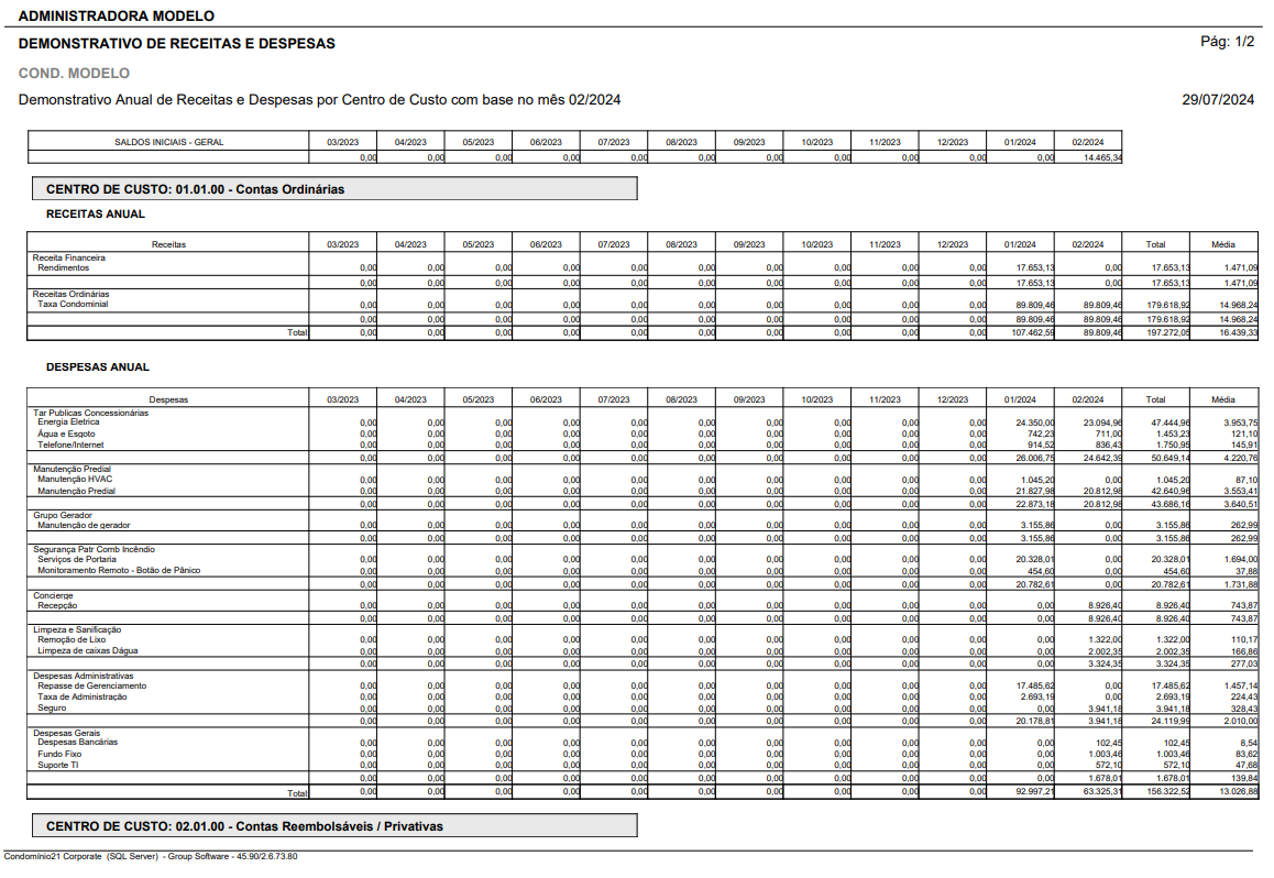 - Quando for utilizado o modelo ANUAL POR CENTRO DE CUSTO selecionando mais de um condomínio, o relatório será gerado somente para o condomínio que utiliza centro de custo.