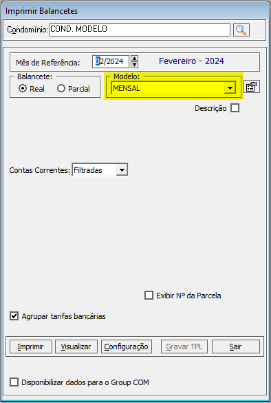- Somente o modelo MENSAL poderá ser utilizado na pasta de prestação de contas, processamento em lote e ser disponibilizado no Group COM.