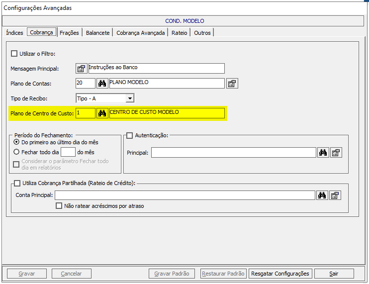 Para utilizar este modelo é necessário apenas que o condomínio esteja configurado para utilizar o centro de custo.
