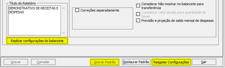 Caso necessário, poderá ser feita a replicação do modelo de balancete agrupado por centro de custo utilizando os botões [Replicar configurações do balancete], [Gravar Padrão] e [Resgatar Configurações] nesta mesma tela:
