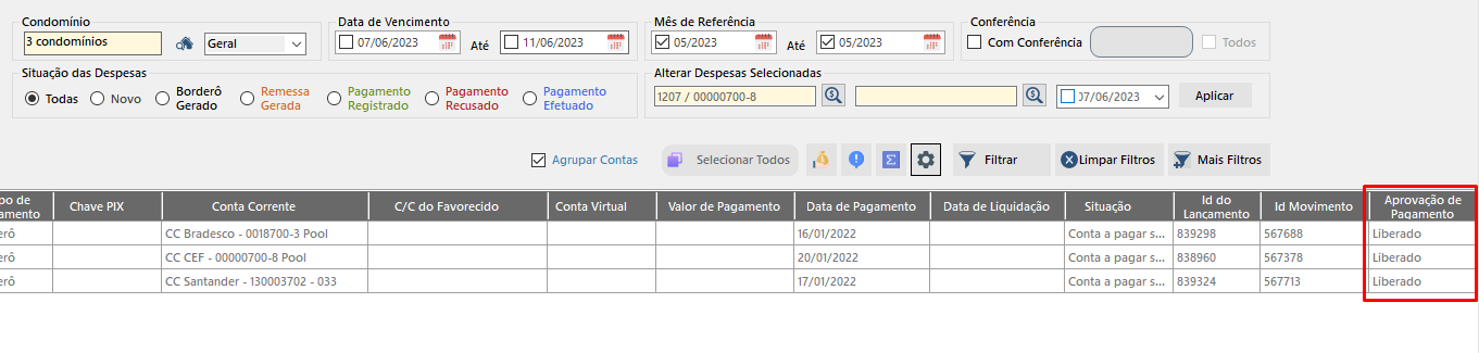 Ao gerar o borderô e remessa, para um condomínio definido para utilização do recurso, a coluna ‘Aprovação de Pagamento’ será atualizada conforme abaixo: