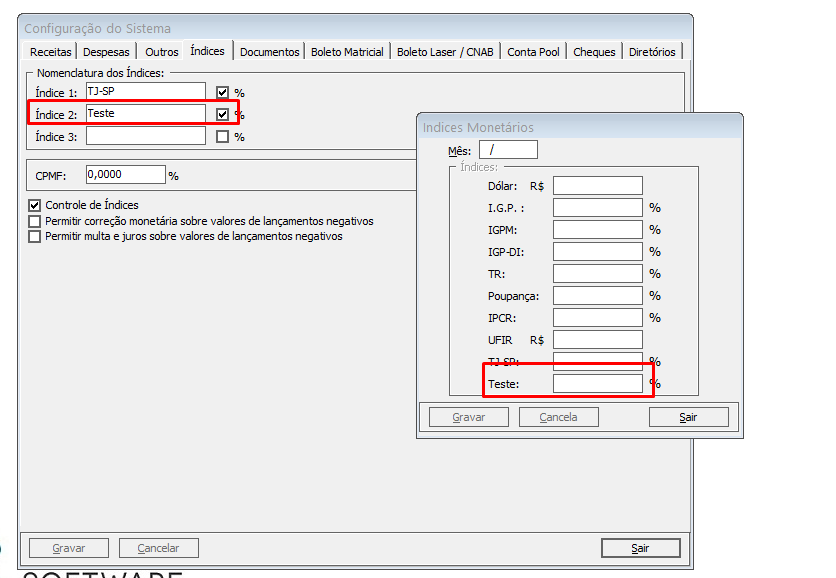 Para cadastrar um novo índice acesse o menu Arquivo > Configuração do sistema > Financeiro > Aba índices.