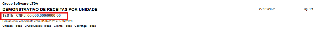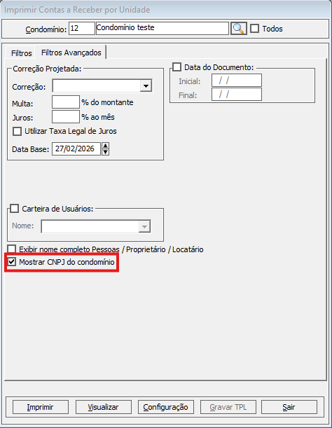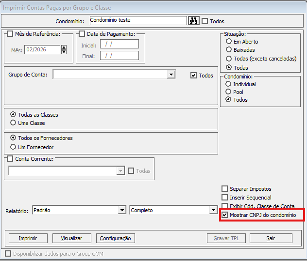 Agora é possível incluir o CNPJ dos condomínios nos relatório A Receber por Unidade – modelo Colunas e Contas Pagas por Grupo e Classe - modelo Padrão.
