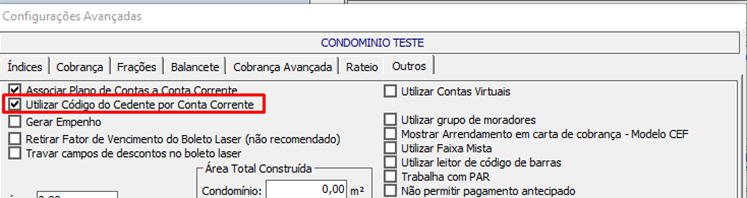 Para essa última é preciso marcar a opção Utilizar Código do Cedente por Conta Corrente presente na mesma tela citada anteriormente, porém na aba Outros, e posteriormente informar o código do cedente no cadastro da conta corrente.