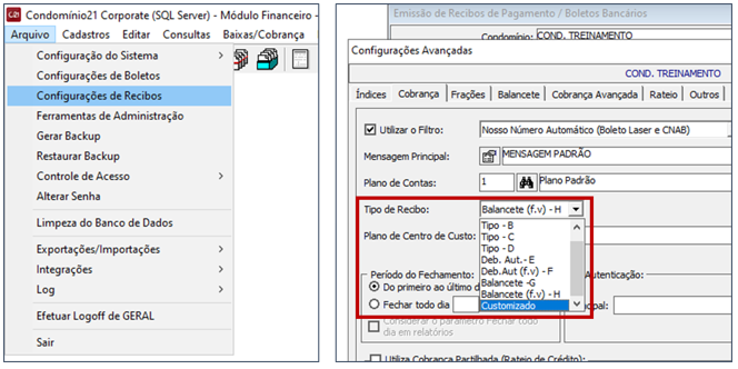 Configuração de Recibos Personalizados: ao selecionar essa opção, o sistema disponibiliza a tela Configuração de Recibos.