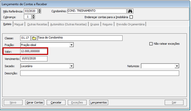 Visualizar resumo do rateio na geração das contas: essa opção, se marcada, apresentará uma mensagem no momento da geração de rateio mostrando os valores que serão lançados no sistema após uma confirmação.