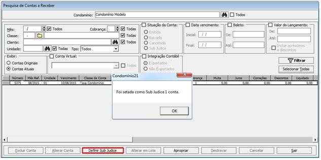 - Este processo de apresentação somente das unidades inadimplentes na tela de Pesquisa de Contas a Receber facilita e direciona a definição das contas para judice, uma vez que este processo também é realizado nesta tela.