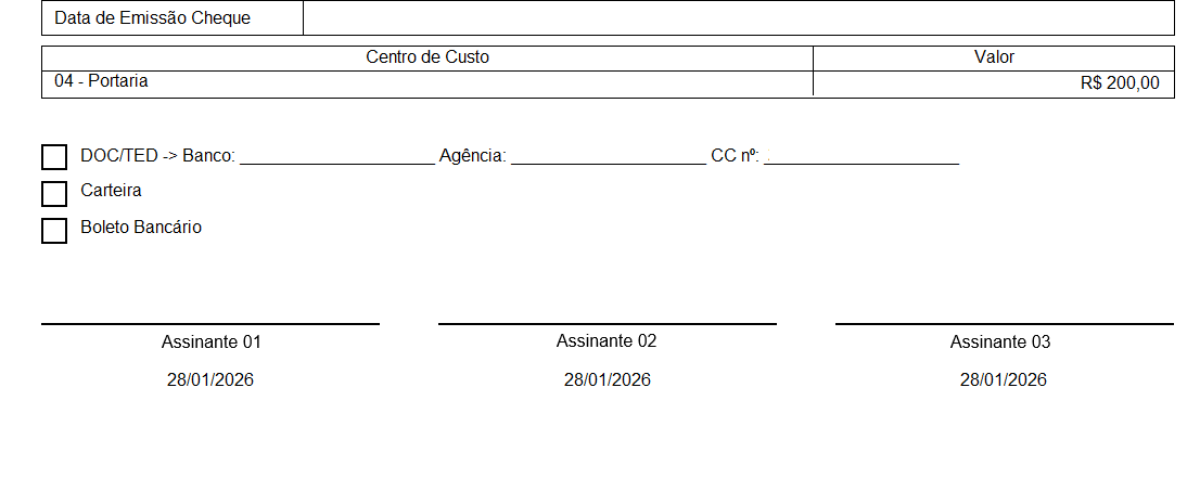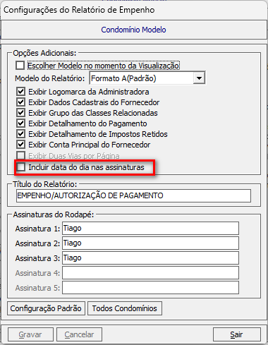 Após a configuração, sempre que um empenho for gerado, a data do dia será exibida automaticamente nos campos de assinatura.