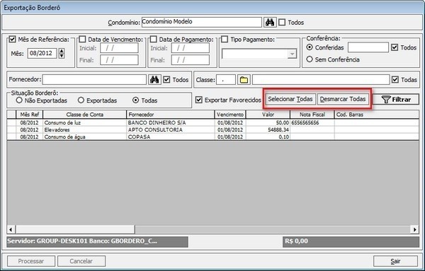 - Exportar Favorecidos: selecione essa opção para exportar os favorecidos das contas para o borderô.