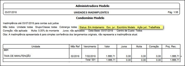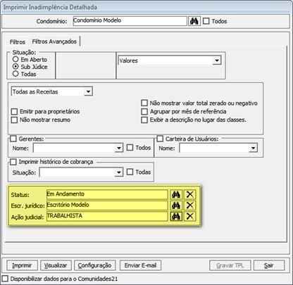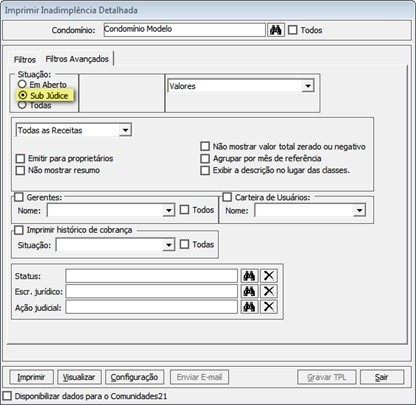 Os campos “Status” e “Ação judicial” que já se faziam presentes nos relatórios de inadimplência, passam a funcionar como filtros para os mesmos. Com isso, será permitido escolher as contas em júdice que estiverem em uma situação ou ação judicial específica.