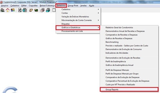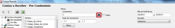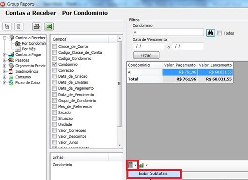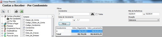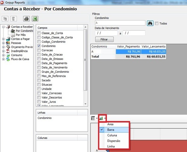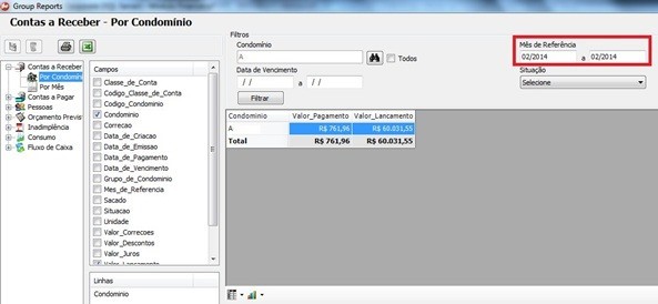 O Group Reports possui algumas opções, como: Filtro por mês de referência inicial e final, filtro por grupo de condomínios e menu de barras de ferramentas, com botão de opções do grid e do gráfico.