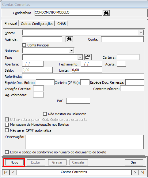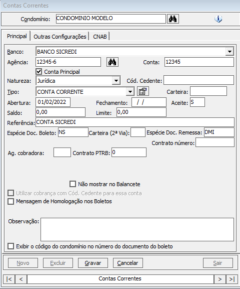 Preencha as informações referente a conta corrente conforme informado pelo banco na aba Principal e Outras Configurações.