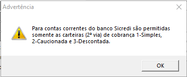 Para o Sicredi CNAB400, as carteiras disponíveis são 1 - Cobrança Simples, 2 - Cobrança Caucionada, 3 - Cobrança Descontada, caso durante o cadastro ou alteração o número da carteira estiver diferente dos citados acima o sistema apresentará a seguinte mensagem: