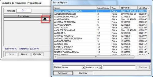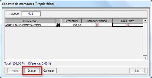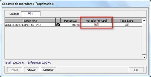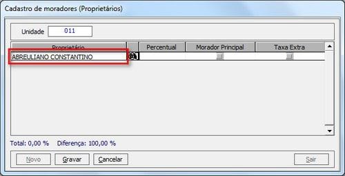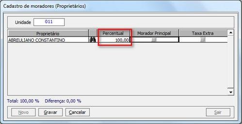 Exemplo: Na unidade 001, possuem os moradores José e Maria, mas apenas o José é responsável pelo pagamento das contas, então, José ficara com a porcentagem 100% e Maria 0%.