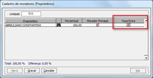 selecionada. Supondo que a taxa extra configurada para os moradores seja de R$ 10,00 sobre a taxa de condomínio, então ao realizar o lançamento essa unidade irá pagar um total de R$130,00 de taxa de condomínio.