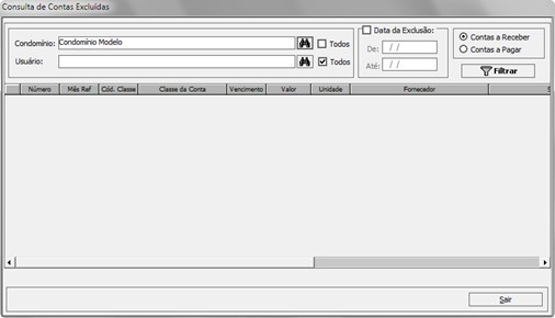 - Por padrão, o condomínio exibido será aquele que estiver em uso, além disso a opção para Todos os usuários estará previamente marcada e primeiramente o filtro de Contas a Receber será o que estará habilitado. Há também o campo Data da Exclusão, que inicialmente estará sem informações de datas.