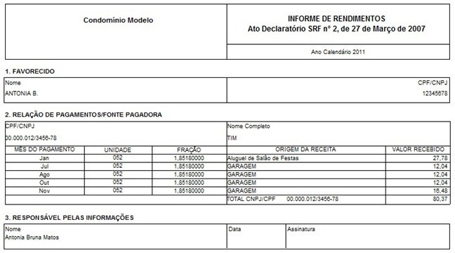 O informe de Rendimentos tem o objetivo de informar aos proprietários de imóveis dos condomínios os valores arrecadados decorrentes da locação das partes comuns, correspondentes à fração ideal da sua unidade.