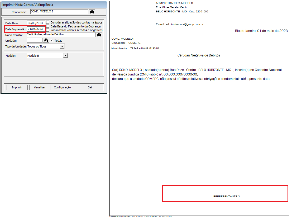 - Nada Consta/Adimplência e Quitação Anual de Débitos: Nestes relatórios é visualizado somente o representante que possui o tipo ‘Síndico’ e a data comparativa com o período de vigência do representante é a ‘Data Impressão’, informada na tela do relatório, e está disponível para todos os modelos.