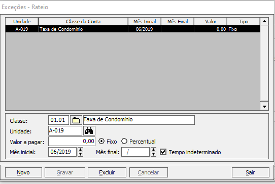 Nessa tela, você poderá definir a unidade que receberá a exceção para o lançamento de uma classe ou mais cadastradas, o valor que a unidade pagará (fixo ou percentual do valor a ser rateado), e o período que deseja que a regra de exceção será válida.