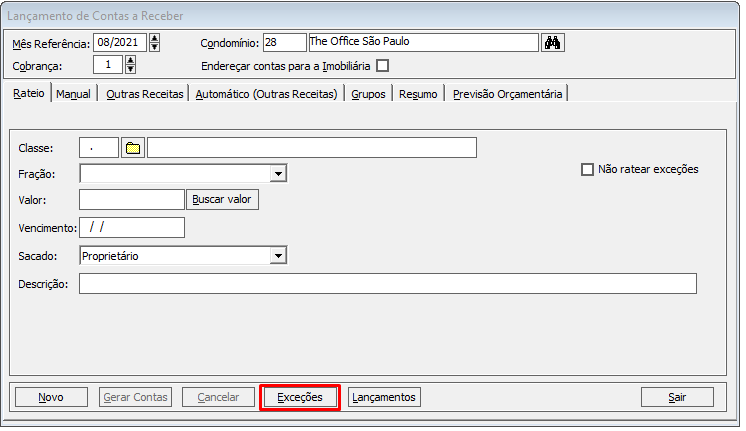 Observe que há um botão com o nome Exceções nas duas telas (Lançamento por Rateio e Lançamento por Grupos).