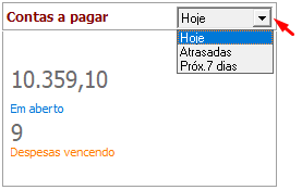 - No card Contas a pagar, onde é exibida a opção ‘Hoje’, clique na seta à direita para que sejam exibidas as opções ‘Atrasadas’ e ‘Próx. 7 dias’.