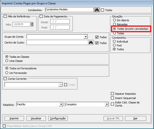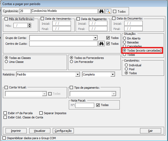 Os relatórios “Pagas por Grupo e Classe” e “A Pagar por Período” passam a contar com o novo filtro “Todas (exceto canceladas)”. Essa melhoria corrige um ponto existente nos relatórios, onde ao selecionar o filtro “Todas”, as despesas canceladas eram sempre incluídas.