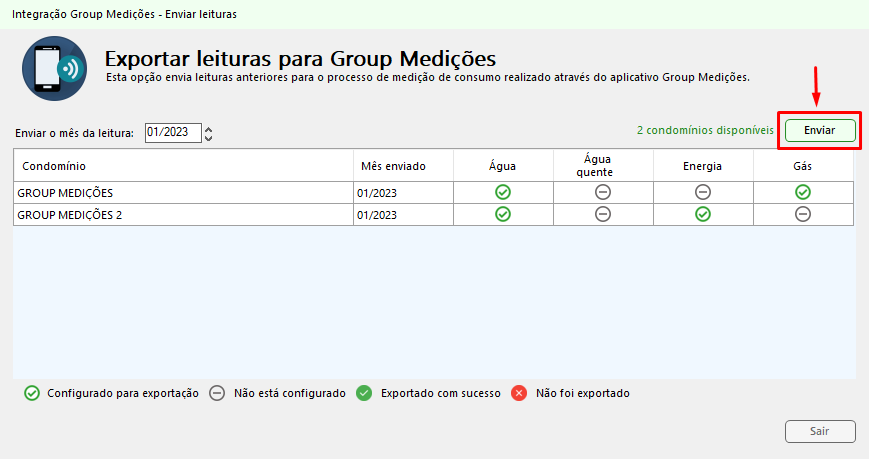 Será enviado para o Group Medições as leituras do mês de consumo que estiver no campo Mês da leitura no canto superior da tela de Exportações.