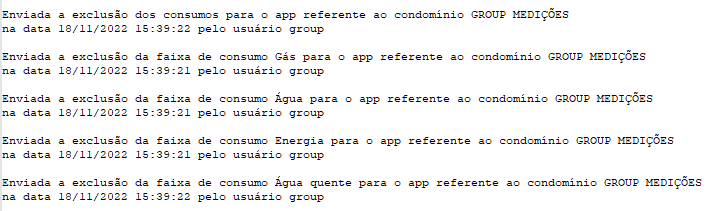 Exemplo: Para o condomínio GROUP MEDIÇÕES, foi informado no log o envio da exclusão de todos os tipos de consumo do condomínio.