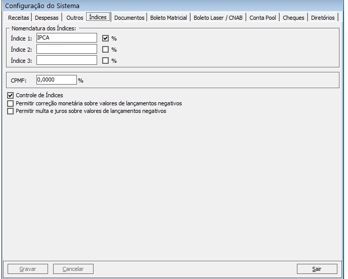No Condomínio21 é possível cadastrar até 3 novos índices, além dos que se encontram disponíveis no menu Editar índices monetários. Para cadastrar um novo índice acesse o menu Arquivo > Configuração do sistema > Financeiro > Aba índices. Na ...