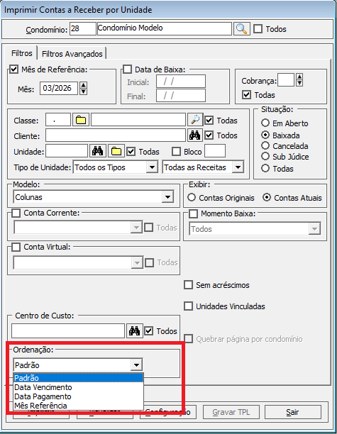 Padrão: Mantém a ordenação habitual do relatório (opção selecionada por padrão).