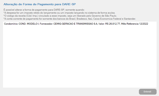 forma de pagamento DARE-SP será identificada automaticamente de acordo com os