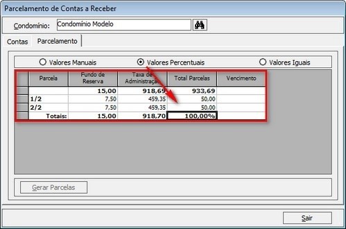Na aba parcelamento, será solicitado o valor de cada parcela e seu vencimento. Dessa forma, o lançamento em aberto ficará indisponível no sistema, e somente as parcelas geradas serão disponibilizadas. Estas parcelas, se atrasadas, que passarão a constar para a inadimplência, e não a conta original.