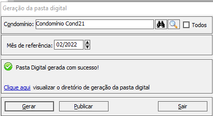 Para gerar o arquivo da pasta digital ou publicar no COM21, acesse o menu Relatórios > Pasta Digital > Geração do relatório e selecione o mês de referência e os condomínios desejados.