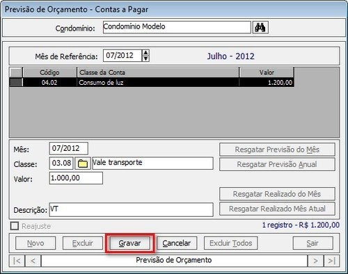 Nesta dela devem ser cadastrados os valores de previsão mensal de contas a pagar do condomínio, para que seja possível visualizar o relatório de Orçamento Previsto x Realizado (Mensal).