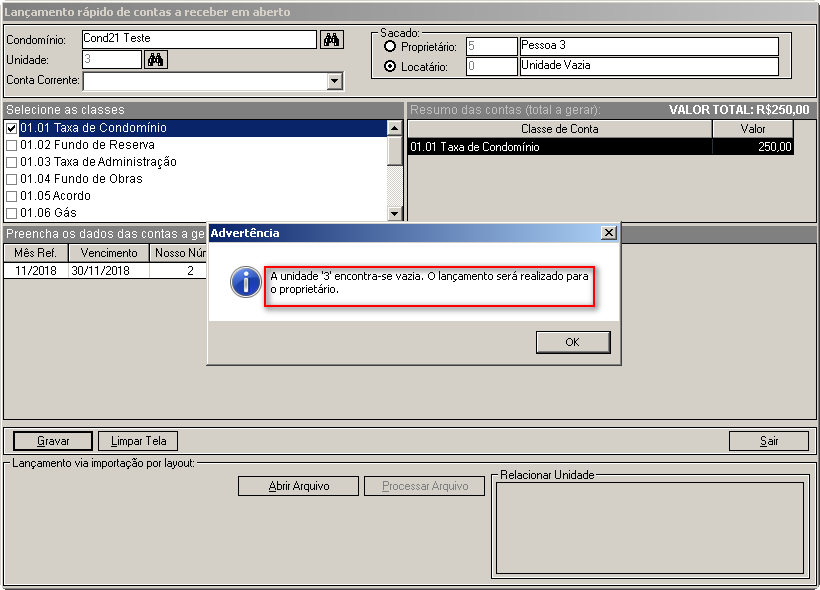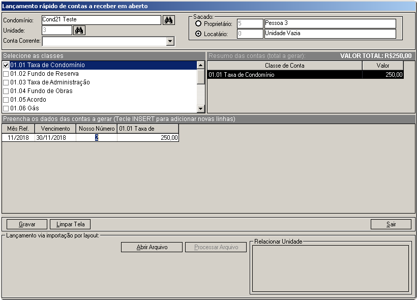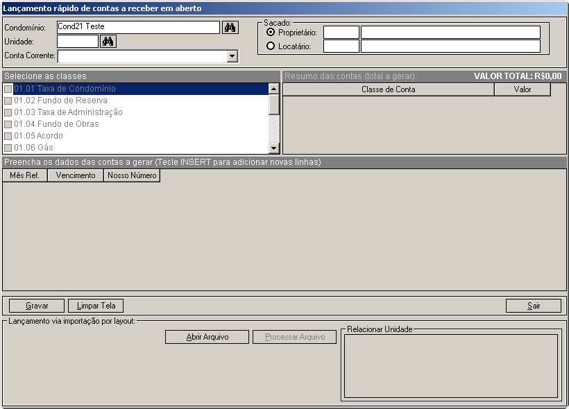 selecione o sacado para o qual será realizado o lançamento: Proprietário ou Locatário.