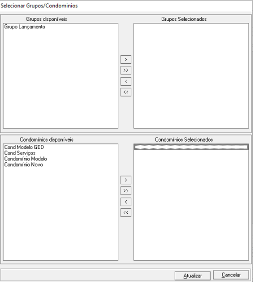na seleção de condomínios. Com a nova opção é possível selecionar um, vários, todos ou um grupo de condomínios. Clique na lupa, selecione os condomínios e clique em Atualizar.