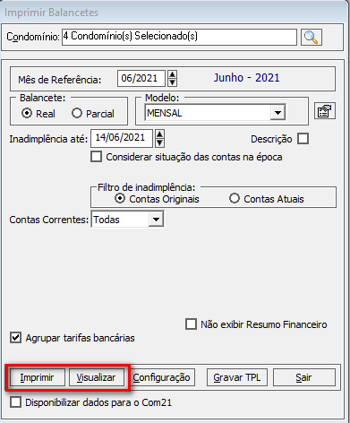 - Ao selecionar um, vários ou todos os condomínios os relatórios serão exibidos de acordo com as configurações de cada condomínio. As configurações são realizadas no menu Cadastro > Condomínios > Configurações Avançadas > aba Balancete.