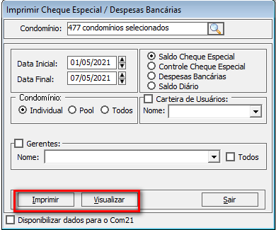 - A visualização do relatório para um, vários, todos e um grupo de condomínio está disponível para todos os modelos do relatório de Cheque Especial/Despesas Bancárias.