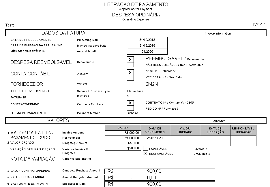 A partir dessa versão do Condomínio21 o relatório de Liberação de pagamento passa a exibir um comparativo entre o valor da fatura x o valor orçado, classificando as contas como Favorável ou Desfavorável.