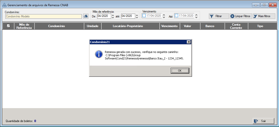Clique no botão Remessa. Inicialmente será apresentado o condomínio que estiver sido escolhido ao entrar no sistema, entretanto ele não será alterado quando escolhermos um condomínio diferente dele no Condomínio21 (troca de condomínios entre telas do sistema).