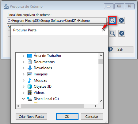 Por padrão o sistema irá apresentar o local que foi configurado no momento da criação/alteração da conta corrente principal ou então o local padrão definido na opção Local e geração de remessa/retorno/backups. Caso deseje selecionar outro local, clique na lupa apresentada na opção Local dos arquivos de retorno.