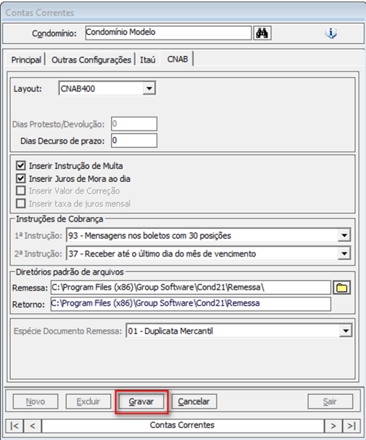 Para que seja possível a geração da remessa no Módulo de Cobrança CNAB dos bancos Bradesco e Itaú CNAB 400, é necessário que as instruções de cobrança CNAB estejam previamente configuradas. Essas configurações passam a ser realizadas no cadastro da Conta Corrente.