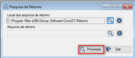 Clique no botão Retorno. Será apresenta a tela para escolher o local onde os arquivos que retorno estão salvos para processamento.
